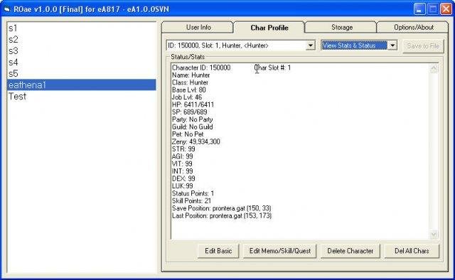 User Account / Kafra Storage / Character Stats / Inventory / Cart editor
