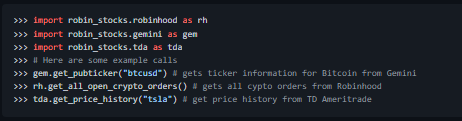 This is a library to use with Robinhood Financial App. It currently supports trading crypto-currencies, options, and stocks. In addition, it can be used to get real-time ticker information, assess the performance of your portfolio, and can also get tax documents, total dividends paid, and more. The code is simple to use, easy to understand, and easy to modify. With this library, you can view information on stocks, options, and cryptocurrencies in real-time, create your own robo-investor or trading algorithm, and improve your programming skills. The supported APIs are Robinhood, Gemini, and TD Ameritrade. If you are contributing to this project and would like to use automatic testing for your changes, you will need to install pytest and pytest-dotenv. You will also need to fill out all the fields in .test.env. I recommend that you rename the file as .env once you are done adding in all your personal information.