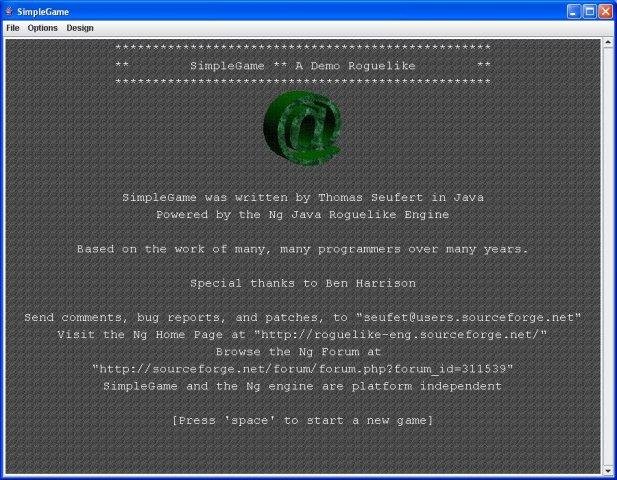 Ng is a 100% Java Roguelike game engine that supports single and massive multiplayer games. SimpleGame is a prototype game that demonstrates most features of the engine and is included in all releases of Ng.