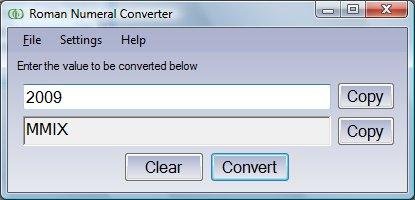 A conversion program written in as a Windows Forms Application in Visual Basic to convert roman numerals to regular numbers and back. It can handle up to 3,999,999. It requires the .NET Framework 3.5 and is licensed under the the CC GNU GPL.