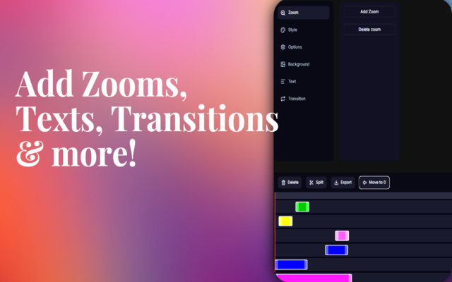 Add zoom effects to highlight important parts of your screen, insert text, captions, images, and audio, apply transitions, and customize backgrounds to make your videos more engaging. RookieClip supports a timeline-based editor with separate tracks for videos, images, text, and audio, giving creators precise control over their projects.