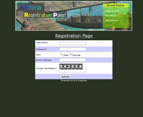 RORegister is a Ragnarok Online Control Panel for eAthena-based Ragnarok Online Servers. RORegister is currently the only Control Panel that supports both flat-file and SQL based eAthena Servers. More information about eAthena here: http://eathena.ws.
