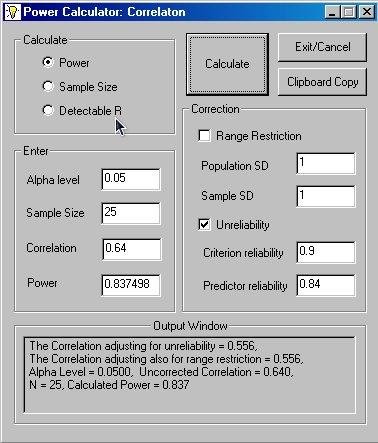 RPowr is a simple calculator for planning correlational research. It computes the power of the Pearson correlation coefficient allowing adjustment for unreliability and range restriction of the variables (e.g. predictor and criterion measures).