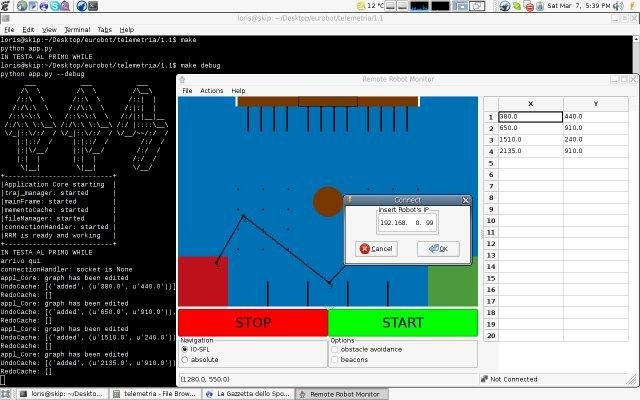 Remote Robot monitor is a wxPython-based interface for controlling and monitoring mobile robots designed to take part to the Eurobot 2009 contest. Provides and interface to exchange data with the DIIT TEAM (http://eurobot.diit.unict.it) Erlang-developed