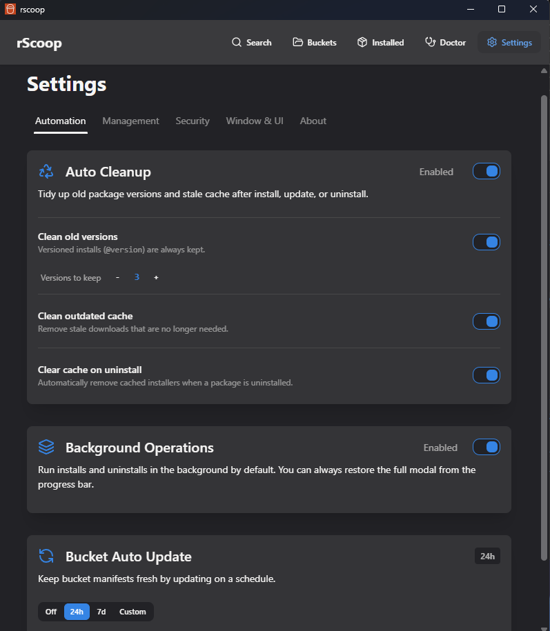 - Buckets: Browse your current buckets, see last-updated timestamps, or search GitHub for community buckets by stars/forks. Add or remove buckets from the UI.