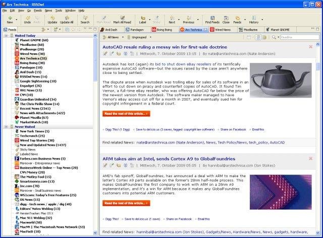 RSS Owl is a powerful application to organize, search and read your news feeds in a comfortable way. It runs cross platform on Windows, Linux and Mac and can also be installed into Eclipse. RSS Owl is translated into the popular languages of the world.