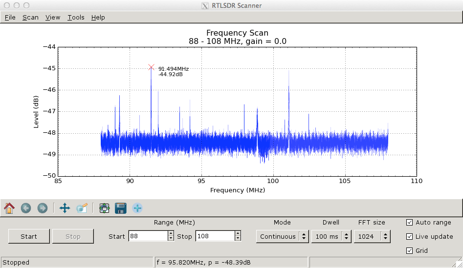 A cross platform Python frequency scanning GUI for USB TV dongles, using the OsmoSDR rtl-sdr library.