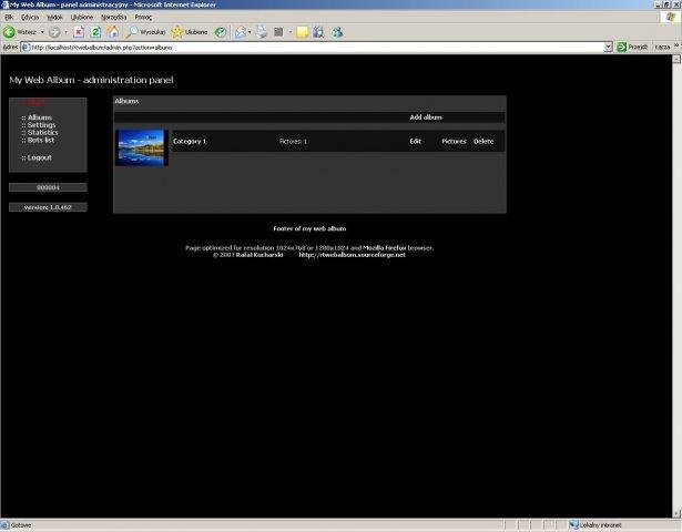 Free web album scripts in PHP. Include administration panel to easy manage content of album. If you decide to use this web album please send me link to your page. I would to see your pictures :) See my gallery on http://rtwebalbum.x12.pl