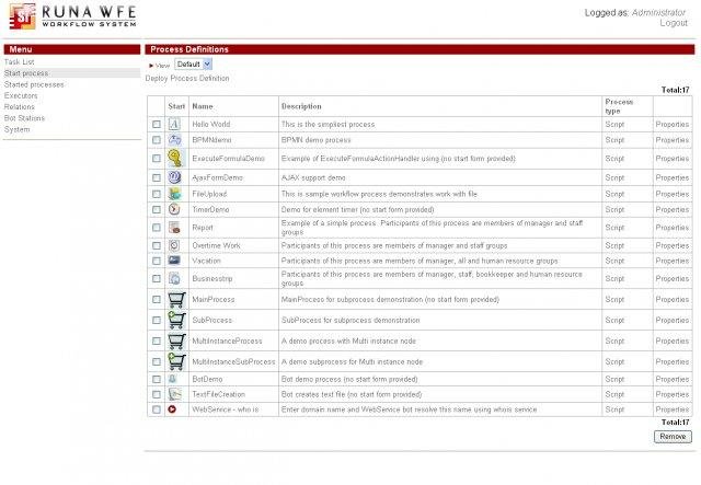 Thanks to RunaWFE web interface users can receive, filter, perform and delegate the tasks of business process instances, start new business process instances, view the properties of started business process instances, deploy new business process definitions. Administrators can: create /remove actors and groups, include /exclude actors to/from groups, grant permissions on system objects to actors and groups, forcibly stop business process instances, add/change actors substitutions rules.