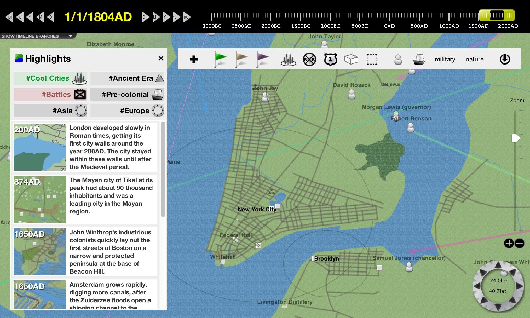 - At its heart is a baseline timeline that documents history from 3000BC to today.