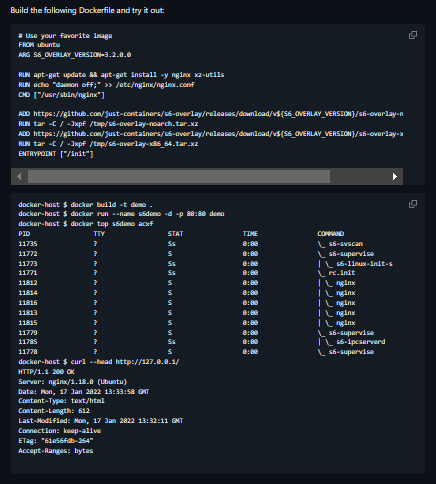 s6-overlay is an easy-to-install (just extract a tarball or two!) set of scripts and utilities allowing you to use existing Docker images while using s6 as a pid 1 for your container and process supervisor for your services.