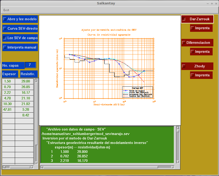 Salkantay es un programa (software) que ejecuta las tareas de interpretación del método eléctrico mono-dimensional, también conocido como Sondeo Eléctrico Vertical (SEV). Tiene incorporadas rutinas para resolver el problema directo así como para el modelamiento inverso. Es interactivo en el método de interpretacion directa, con lo que se consigue ajustar los datos a un modelo teórico manualmente y aplicando los conocimientos y experiencia del interpretador. Están implementadas tres rutinas de inversión automática. Produce archivos gráficos de alta calidad en post-script.
