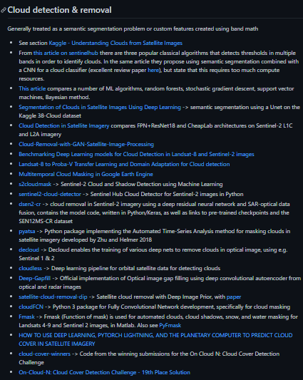 This page lists resources for performing deep learning on satellite imagery. To a lesser extent classical Machine learning (e.g. random forests) are also discussed, as are classical image processing techniques. Note there is a huge volume of academic literature published on these topics, and this repository does not seek to index them all but rather list approachable resources with published code that will benefit both the research and developer communities. If you find this work useful please give it a star and consider sponsoring it. You can also follow me on Twitter and LinkedIn where I aim to post frequent updates on my new discoveries, and I have created a dedicated group on LinkedIn. I have also started a blog here and have published a post on the history of this repository called Dissecting the satellite-image-deep-learning repo.