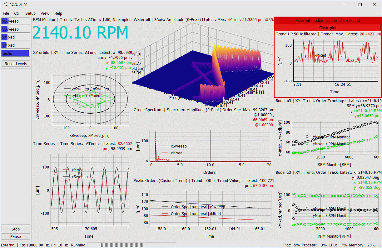 - Data Plotting: Raw/Time Series plots, Trend plots (Mean, Peak, Min/Max, RMS, Variance, Kurtosis, Skew, MAD, Tacho), Spectrum plots (FFT, FRF, Order), Orbits plots, Bode plots, Waterfall plots