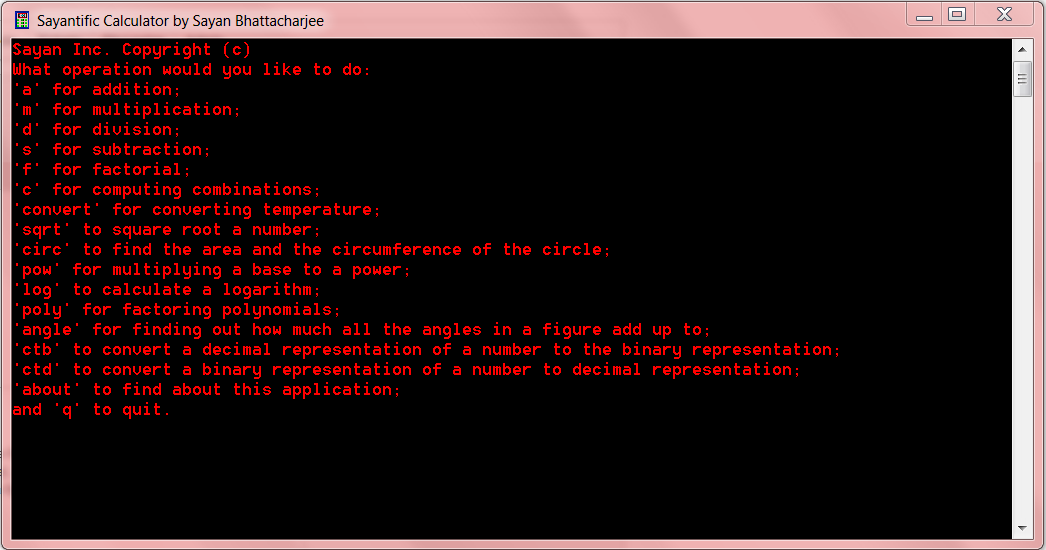 A calculator that can do the 4 basic functions, calculate factorials, convert temperatures, calculate square roots, find properties of a circle (area and circumference), raise number to a power, calculate a log, factor polynomials, calculate the total angle measure in a figure with n sides, convert a decimal representation of a number to the binary representation, and vice versa.