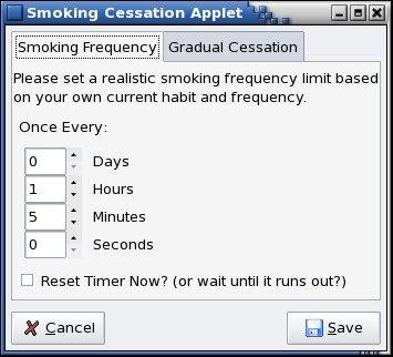 A Panel Applet designed to Decrease Smoking. The icon changes from a non-smoking sign to a smoking sign after a user-set duration. The timer restarts when the applet is clicked. The user can set an amount of time to add to the timer after each smoke.