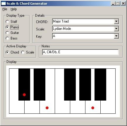 Scale & Chord Generator gives a visual display of chords and scales in any key on a musical staff, keyboard, guitar fretboard and bass guitar fretboard. Each note of the chosen chord or scale is displayed along with a related chord or scale to be played