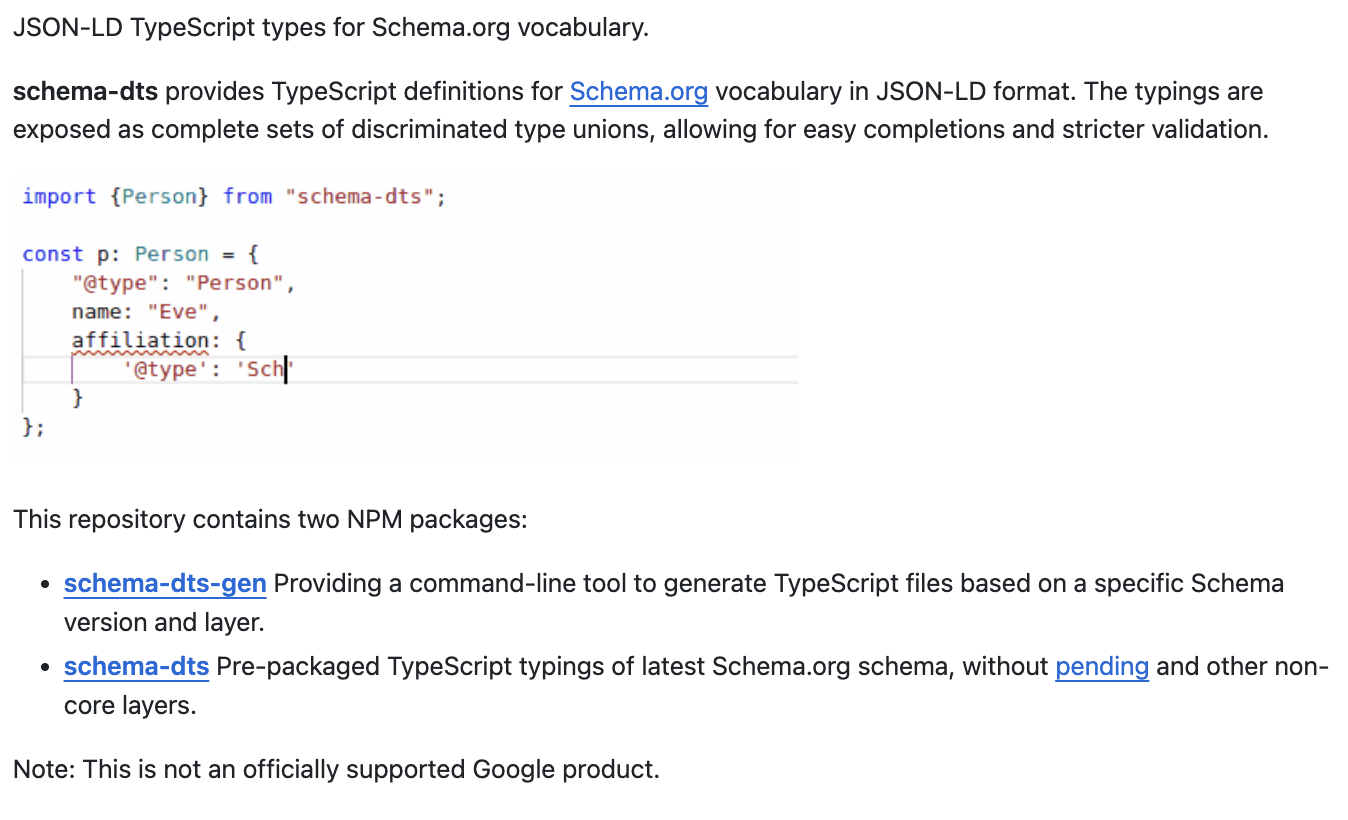 - Offers a CLI generator (schema-dts-gen) to build custom typings from any Schema ontology