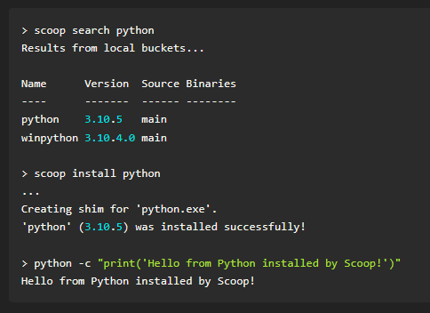 Scoop is a command-line installer for Windows. If you have built software that you would like others to use, Scoop is an alternative to building an installer (like MSI or InnoSetup). You just need to compress your app to a .zip file and provide a JSON manifest that describes how to install it. Scoop downloads and manages packages in a portable way, keeping them neatly isolated in ~\scoop. It won't install files outside its home, and you can place a Scoop installation wherever you like. For terminal applications, Scoop creates shims, a kind of command-line shortcut, inside the ~\scoop\shims folder, which is accessible in the PATH. For graphical applications, Scoop creates program shortcuts in a dedicated Start menu folder, called 'Scoop Apps'. This way, packages are always cleanly uninstalled and you can be sure what tools are currently in your PATH and in your Start menu.