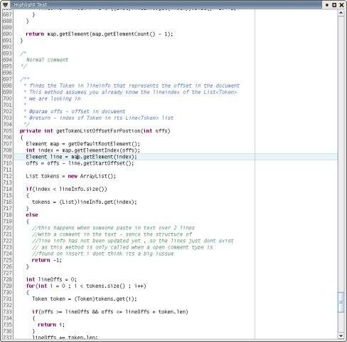 SDoc is a fast, easy to use Java syntax highlighting library for Swing. It is implemented as a custom Swing text document that uses JFlex.