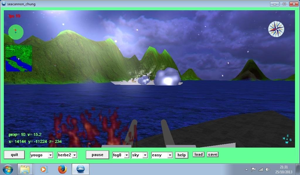 seacannon chung is a free 3D fps sea battle ship battleship cannon and sail combat simulation sim game , written in freebasic and openGL , with real satellite coast maps , moving sea and explosion effects.