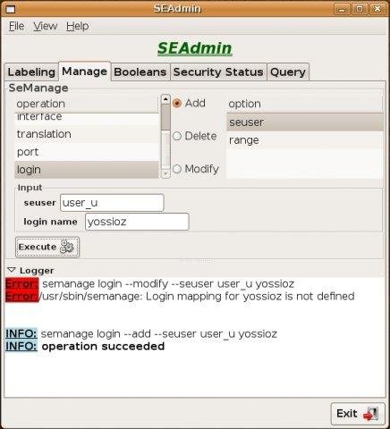 SEAdmin tool is basically a GUI wrapper of common scripts used to manage, configure and viewing information, on SELinux system. SEAdmin was developed with mono and GTK#