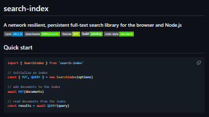Search-Index is a lightweight and fast JavaScript-based search engine that enables full-text search indexing and retrieval for web applications.