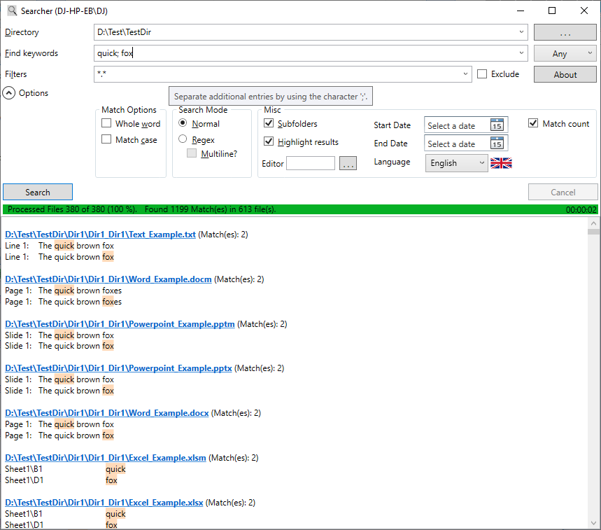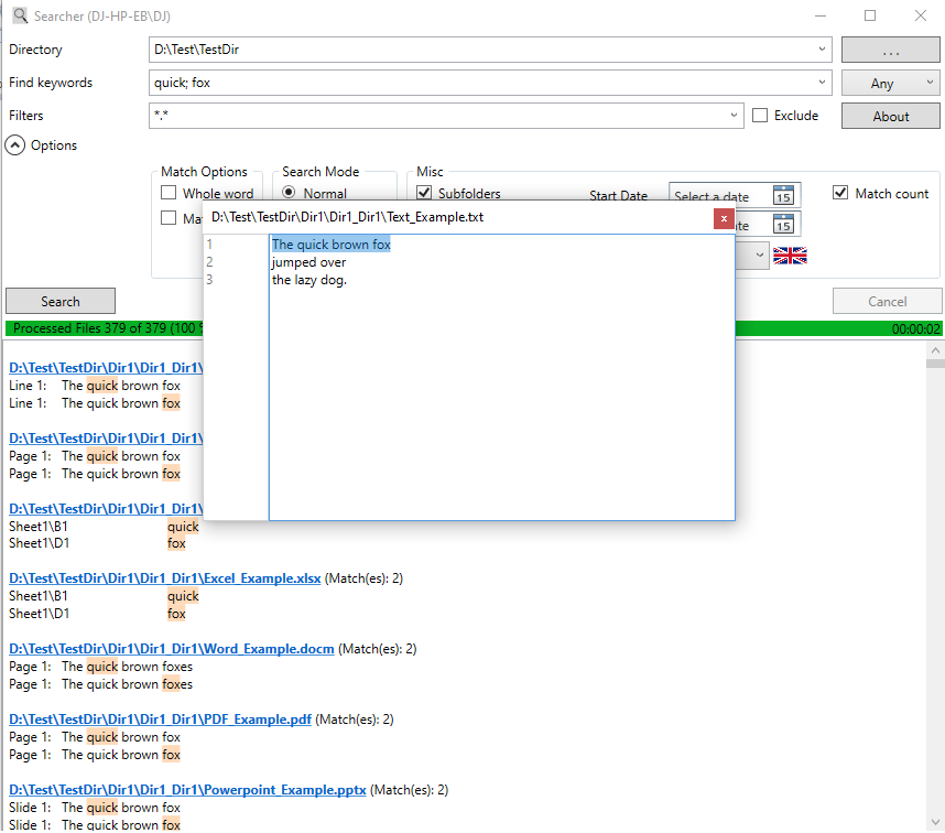 - Allows searching in Word (docx), Excel (xlsx), Powerpoint (pptx) and PDF (pdf) documents.
