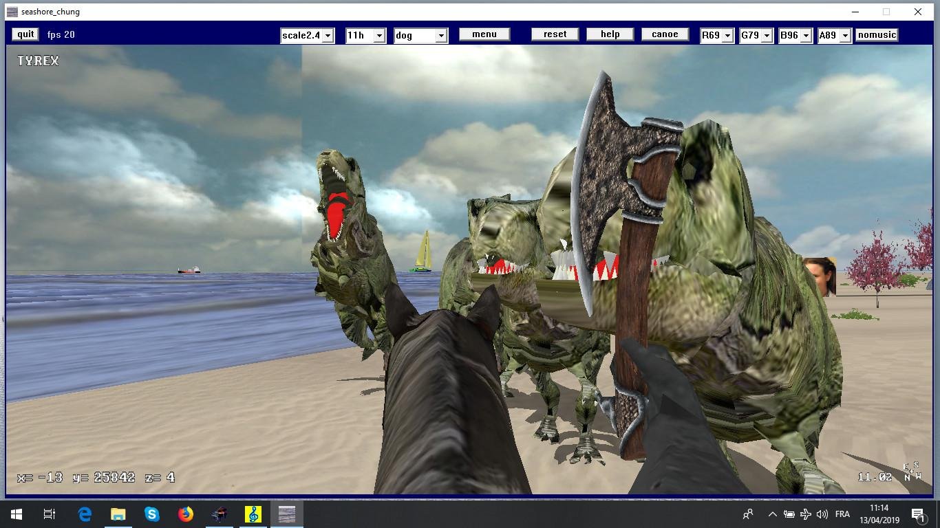 seashore chung is a 3D opengl seashore virtual beach island swim / wind sailship / horse ride / dive underwater / explore sandbox fps game with video photorealistic ocean sea animated textures made with glvideotexture_chung and buildings town obj exported from freewebcar_chung written in easy fast freebasic .Axe sword mace weapons and Tyrex , giant Spider , orc , pirate , barbare hack & slash mode included .