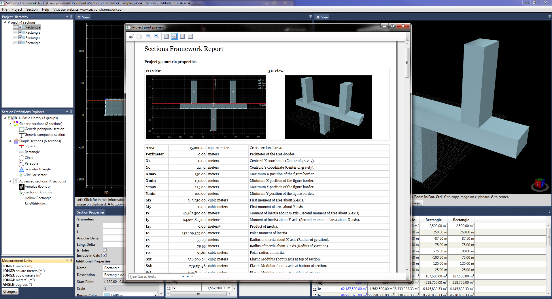 Software for calculating geometric properties of cross sections and polygons. Calculates: area, moments of inertia, product of inertia, radius of gyration, section modulus, among others. It also supports import and export of CSV, JSON and DXF files. Able to do geometric transformations and 2D and 3D visualization of the cross sections.