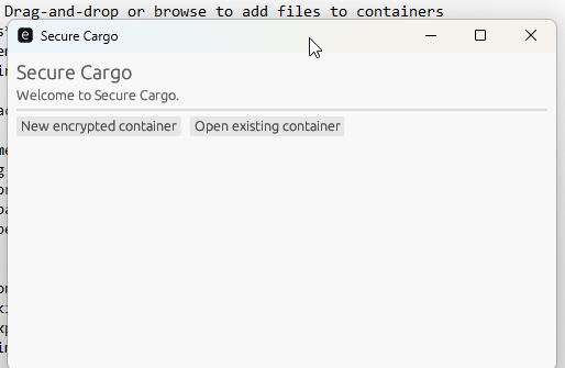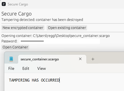 A secure, encrypted file container application built with Rust and eframe. Secure Cargo allows you to create password-protected containers that can store multiple files with military-grade encryption, tamper detection, and optional self-destruct functionality.