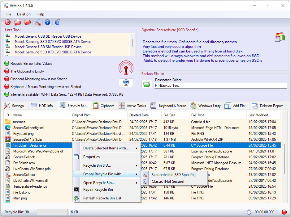 - Upon startup, SecureDel performs a scan of all disk drives, USB drives, or other mass storage devices installed or connected to the system. A detailed report by type and brand will be displayed in the main window. A targeted analysis of the hard disks installed in the system will also be performed, with a report displaying their characteristics, including used and available space.