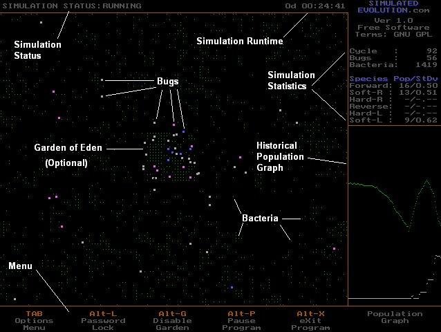 MS-DOS VGA program demonstrates the concepts of evolution via reproduction, mutation and natural selection, all in an interactive graphical environment you can control in real time. This is not your grandfather's DOS program. Must see to believe!