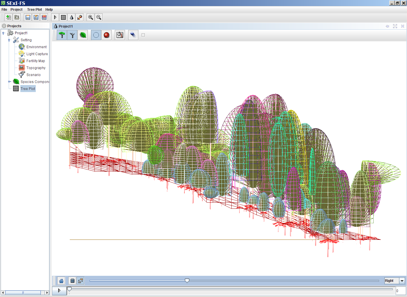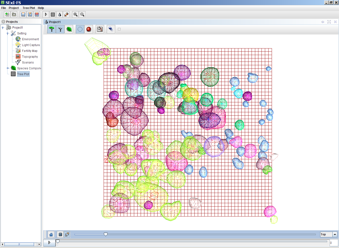 The model uses an object-oriented approach where each tree is represented by an instance of a generic class of tree. The simulated object trees, mimicking real trees, interact through modifying their neighbors' environment. These modifications are mediated through two major resources: space and light. A 3D representation of a one-hectare plot of forest serves as the grounds for the simulation of this competition.