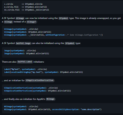 At WWDC 2019, Apple announced a new library of icons that came included with that year's new operating system versions. To browse them, there's a dedicated Mac app called SF Symbols. You can be sure your symbol code won't crash due to typos or symbol availability issues. This is because all symbols are tested via a CI (on the latest iOS & tvOS versions and also some earlier OS versions). Lookups in the SF Symbols app (e. g. about available layersets, available localizations & the look of the symbol) are no longer needed because every symbol is documented in code. Multiple SF Symbols versions are supported at the same time (via utilization of the @availability flag). Each symbol is only made available on those platform versions where Apple says it's available. Renamed symbols can be detected easily (via a deprecation notice which suggests the use of the new name at the same time).