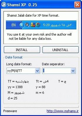 An open source approach to display Solar date in MS-Windows XP.his tool will changes standard TimeStamp of windows to a solar date. After install, solar date string embed to every windows date peresentation that uses LongTimeFormat.