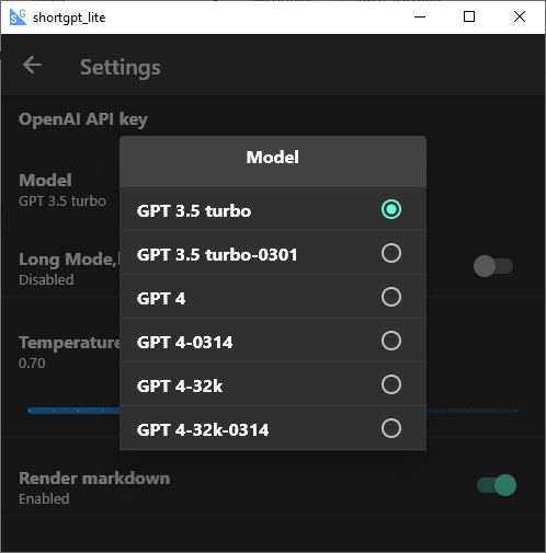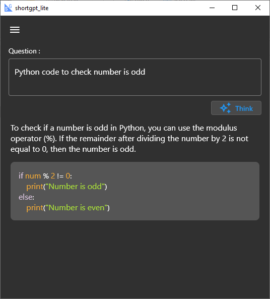 Short GPT Lite is a simple tool for Windows/Linux based on OpenAI's GPT3/GPT4 large language model. The main focus is to get quick and concise answers from GPT.