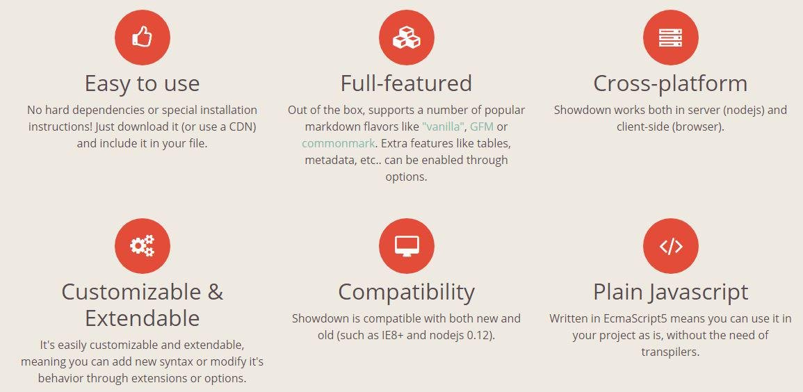 A Markdown to HTML bidirectional converter written in Javascript! Showdown is a Javascript Markdown to HTML bidirectional converter, based on the original works by John Gruber. Showdown can be used client side (in the browser) or server side (with nodejs). See it working in the live demo! No hard dependencies or special installation instructions! Just download it (or use a CDN) and include it in your file. Out of the box, supports a number of popular markdown flavors like "vanilla", GFM or commonmark. Extra features like tables, metadata, etc., can be enabled through options. Showdown works both in server (nodejs) and client-side (browser). It's easily customizable and extendable, meaning you can add new syntax or modify it's behavior through extensions or options. Showdown is compatible with both new and old (such as IE8+ and nodejs 0.12). Written in EcmaScript5 means you can use it in your project as is, without the need of transpilers.