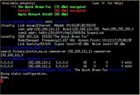 shtumble is a shell-based wireless network stumbler and configuration tool. it lets you monitor visible networks, and configure encryption and IP addressing. it can also be used in a command-line mode to auto-connect on boot, or after suspend.