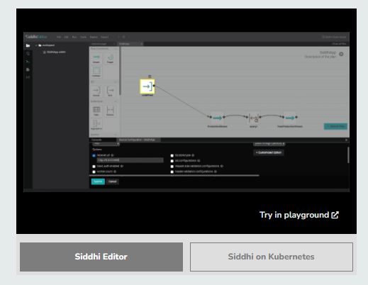 - Siddhi provides web-based graphical and textual tooling for development