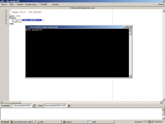 sIDE is a crossplataform (Linux/Win32) made in Lazarus, consist on a basic integrated development enviroment (IDE) for the FreePascal programming language.
