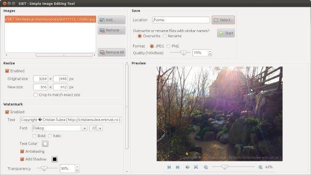 SIET, the Simple Image Editing ( Editor ) Tool, is a simple-to-use, handy and free application for such tasks as resizing, cropping, retouching, watermarking, etc... Batch processing is also provided. Because is OS Independent, written in an interpreted language, SIET can run on any platform that has a java virtual machine available. Tested on: Windows 7, Windows XP, Linux Ubuntu, Linux Mint.