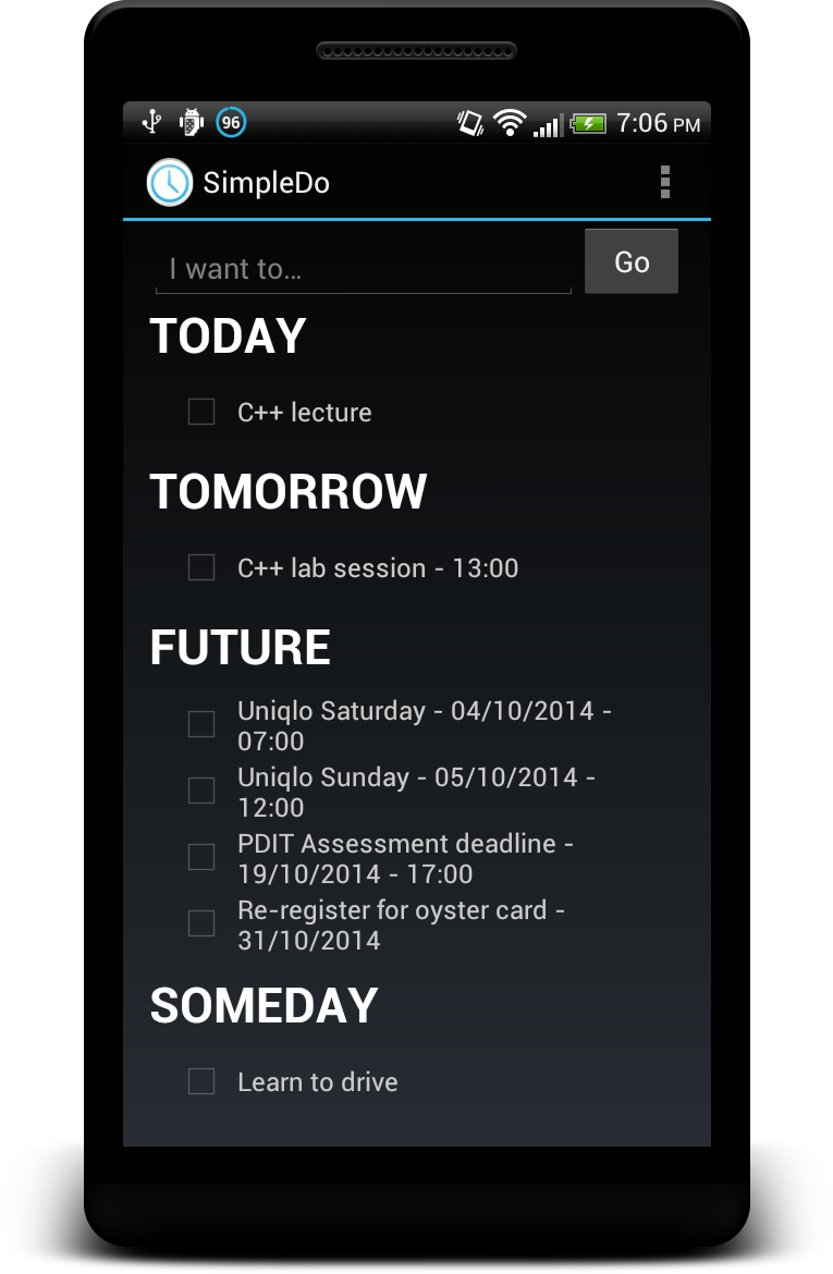 A simple, open source 'To-Do' application for Android, with an emphasis on minimalism. Available free on GooglePlay, for Android 4.0.1 and up.