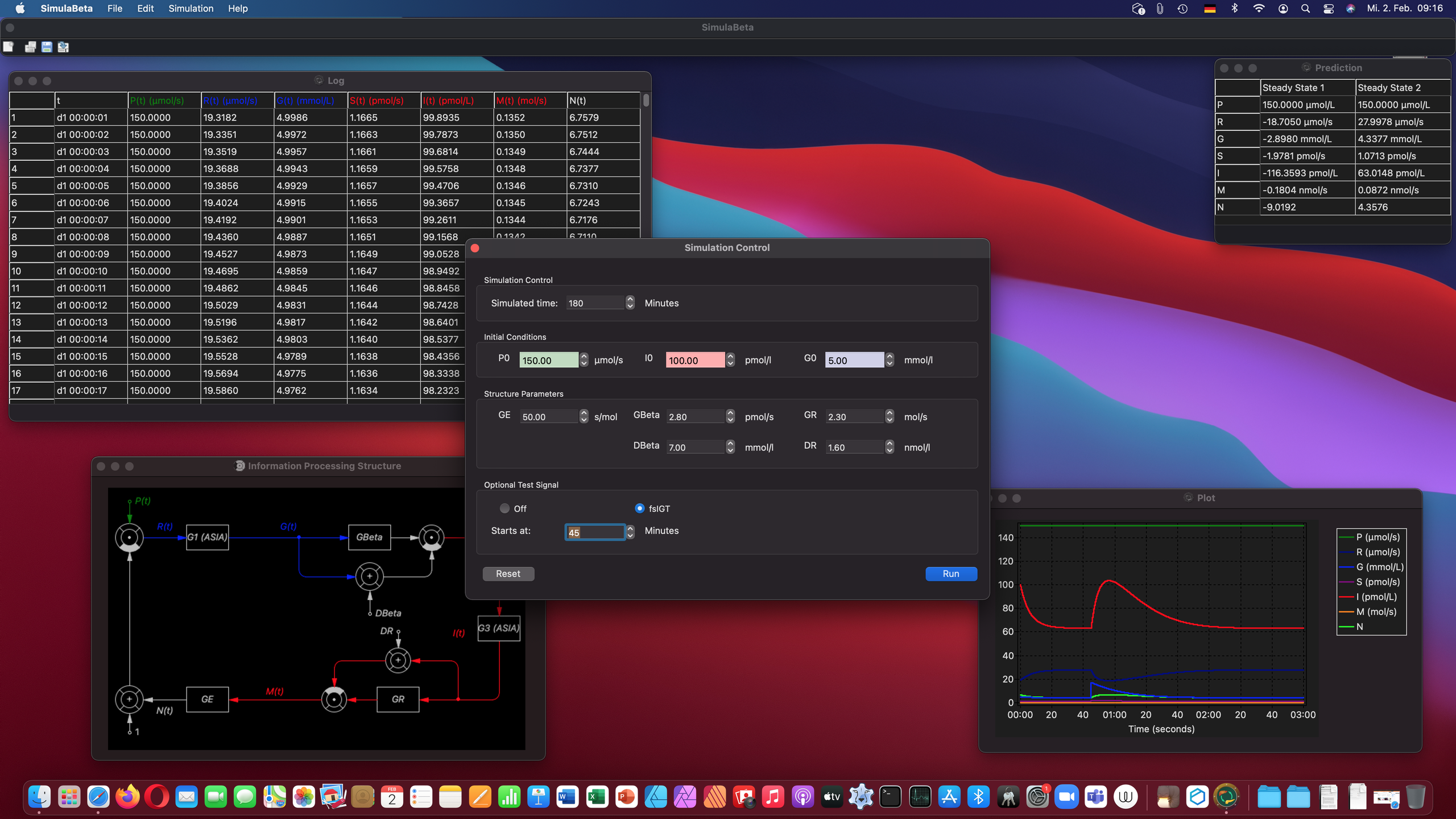 SimulaBeta is a simulation program for insulin-glucose feedback control. It is based on a nonlinear MiMe-NoCoDI model.