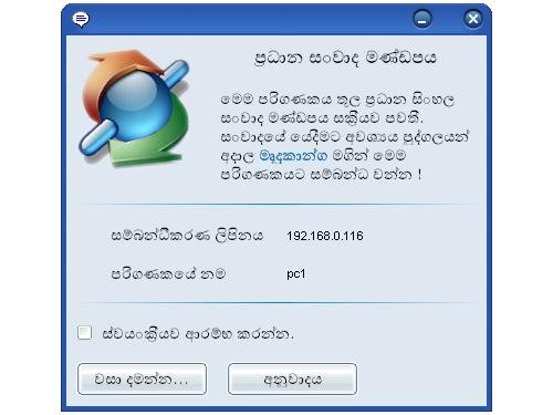 SinhalaChat is a chat system for the LAN users. All the SinhalaChat user interfaces are in Sinhala language and messaging system supports for the Unicode. Both Sinhala chat client / server are in single distribution.