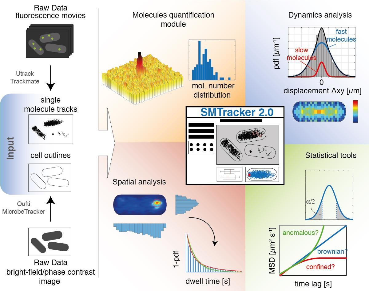 SMTracker v2.0 is a MATLAB-based graphical user interface (GUI) for automatically quantifying, visualising and managing SMT data via five interactive panels, allowing the user to interactively explore tracking data from several conditions, movies and cells on a track-by- track basis. Diffusion parameters and motion behaviour is analysed by several methods: a) by a Gaussian mixture model ,or b) by using the cumulative probability distribution of square displacements, c) Mean-Squared displacement fits, d) by Jump Distance analysis. It also includes exploratory tools to visualise single trajectories or dynamic heat maps.
