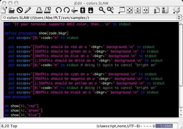 SLAWscript is a simple interpreted scripting language designed to enable the easy production of command-line applications. It should be able to run on any system where Java (non-Micro Edition) version 1.5 or higher is available.