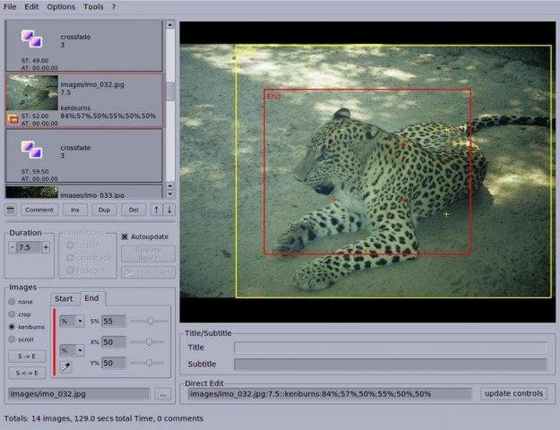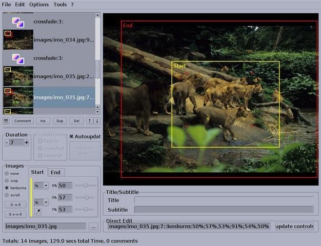 Slideshow creator is a GUI to create, modify and preview jpg (jpeg) images slideshows to be later finalized with dvd-slideshow. Effects like crop, kenburns and scroll permit to realize beautiful high quality DVD slideshows.