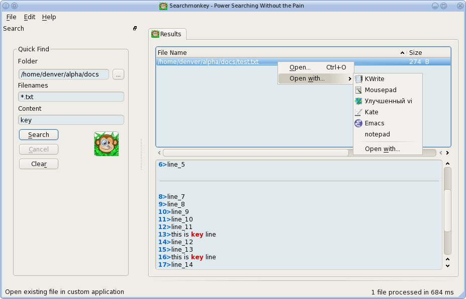 Power searching without the pain. Perform powerful desktop searches without having to index your system using regular expressions. Graphical equivalent to grep.
