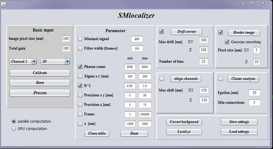 SMLocalizer is a CUDA enabled ImageJ plugin for single molecule localization microscopy.